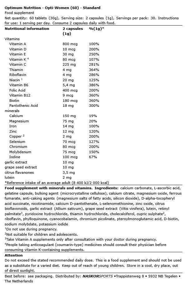 - Opti-WomenTM liefert alles Wesentliche in einer Pille, die Sie morgens und abends nehmen. Bequem und komplett ist es das ultimative Nährstoffsystem für die aktive Frau.