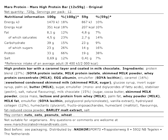 Wenn Ihr auf der Suche nach einem neuen und leckeren Weg seid um Protein in Ihrer Ernährung zu genießen, werdet Ihr diesen neue Protein Ba lieben ! Der neue MARS Protein Bar enthält nur 200 Kalorien und hat das Ernährungsprofil, das man von einem führenden Protein Bar erwartet, aber mit all dem guten Geschmack Eurer Lieblings Süssigkeit. Der MARS Protein Bar enthält 19g Protein in Kombination mit weichem Karamell und Schokolade. Die einzeln verpackten MARS Protein Bars können problemlos in jede Turntasche gelegt werden. Eiweißriegel werden mit dem leckeren MARS Protein Bar auf ein neues Niveau gebracht.
