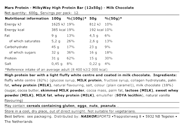 Wenn Ihr auf der Suche nach einem neuen und leckeren Weg seid um Protein in Ihrer Ernährung zu genießen, werdet Ihr diesen neue Protein Ba lieben ! Der neue Miky Way Protein Bar enthält nur 200 Kalorien und hat das Ernährungsprofil, das man von einem führenden Protein Bar erwartet, aber mit all dem guten Geschmack Eurer Lieblings Süssigkeit. Der Miky Way Protein Bar enthält 19g Protein in Kombination mit weichem Karamell und Schokolade. Die einzeln verpackten Miky Way Protein Bars können problemlos in jede Turntasche gelegt werden. Eiweißriegel werden mit dem leckeren Miky Way Protein Bar auf ein neues Niveau gebracht.