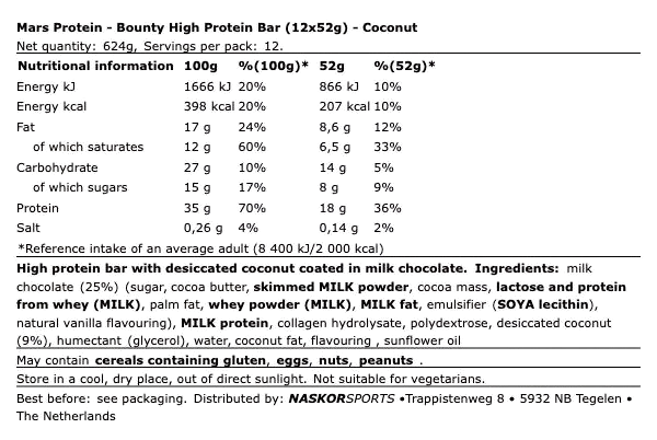 Wenn Ihr auf der Suche nach einem neuen und leckeren Weg seid um Protein in Ihrer Ernährung zu genießen, werdet Ihr diesen neue Protein Ba lieben ! Der neue Bounty Protein Bar enthält nur 200 Kalorien und hat das Ernährungsprofil, das man von einem führenden Protein Bar erwartet, aber mit all dem guten Geschmack Eurer Lieblings Süssigkeit. Der Bounty Protein Bar Bar enthält 19g Protein in Kombination mit weichem Karamell und Schokolade. Die einzeln verpackten Bounty Protein Bar können problemlos in jede Turntasche gelegt werden. Eiweißriegel werden mit dem leckeren Bounty Protein Barauf ein neues Niveau gebracht.